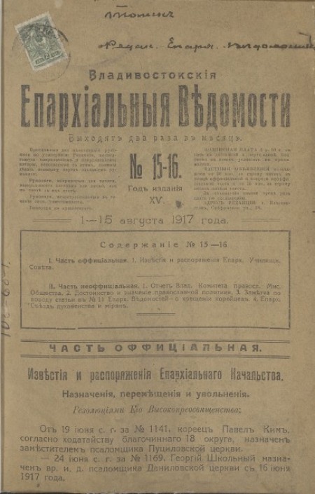 Владивостокские Епархиальные ведомости :. - 1917. - № 15-16 (1-15 августа)