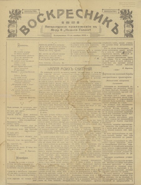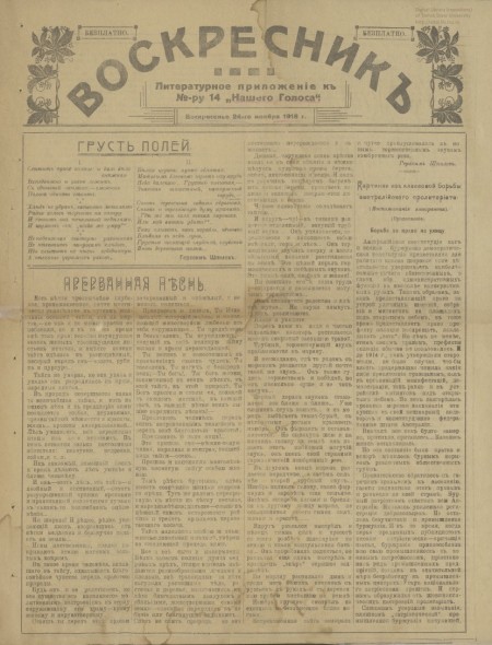Воскресник : литературное приложение к № 8, №24 "Нашего Голоса". - 1918. - № 8 (17 ноября)