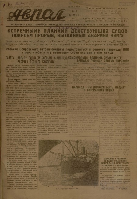 Аврал : орган партруководства речфлота Новосибирского и Томского райкомводов. - 1931. - № 1 (17 мая)