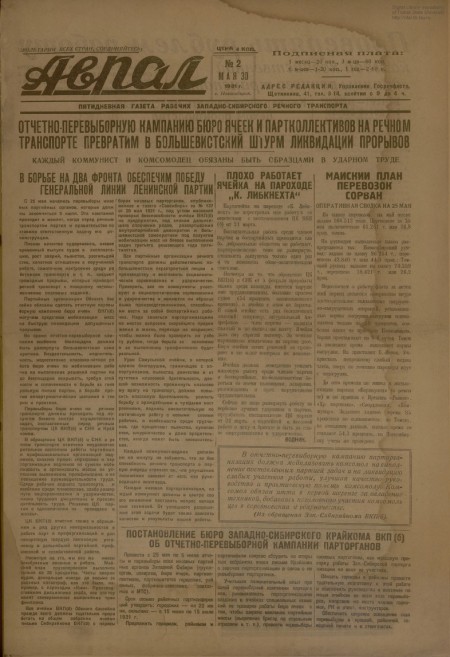 Аврал : орган партруководства речфлота Новосибирского и Томского райкомводов. - 1931. - № 2 (30 мая)