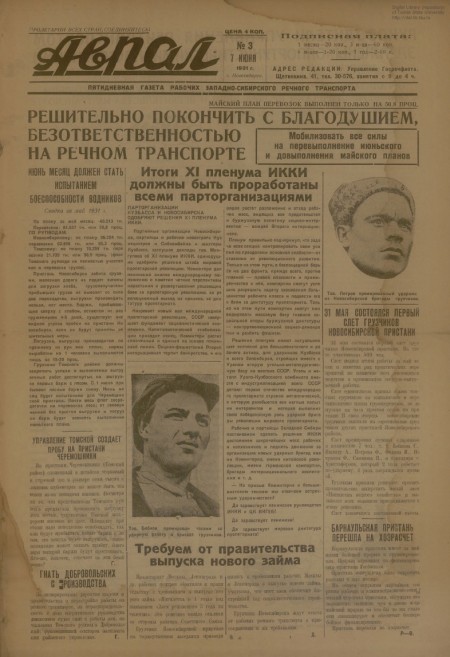 Аврал : орган партруководства речфлота Новосибирского и Томского райкомводов. - 1931. - № 3 (7 июня)