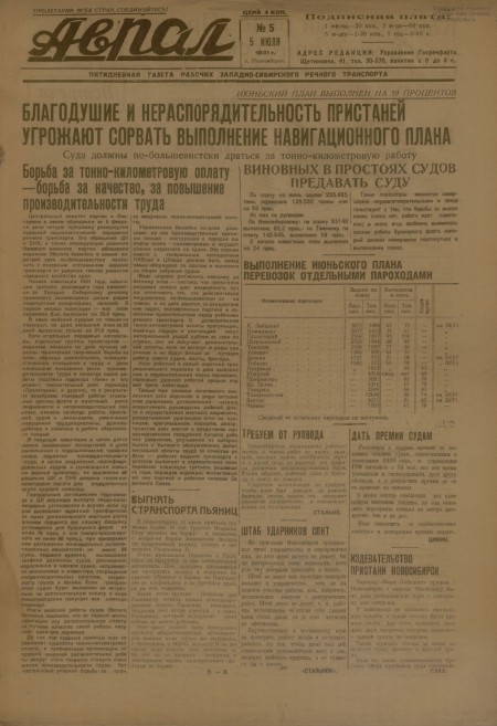 Аврал : орган партруководства речфлота Новосибирского и Томского райкомводов. - 1931. - № 5 (5 июля)