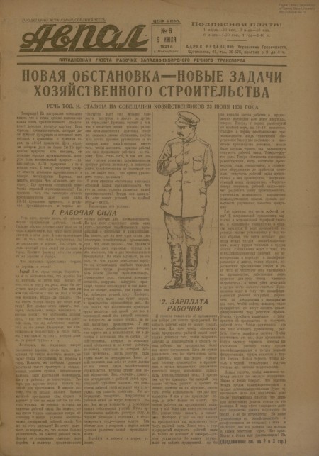 Аврал : орган партруководства речфлота Новосибирского и Томского райкомводов. - 1931. - № 6 (9 июля)