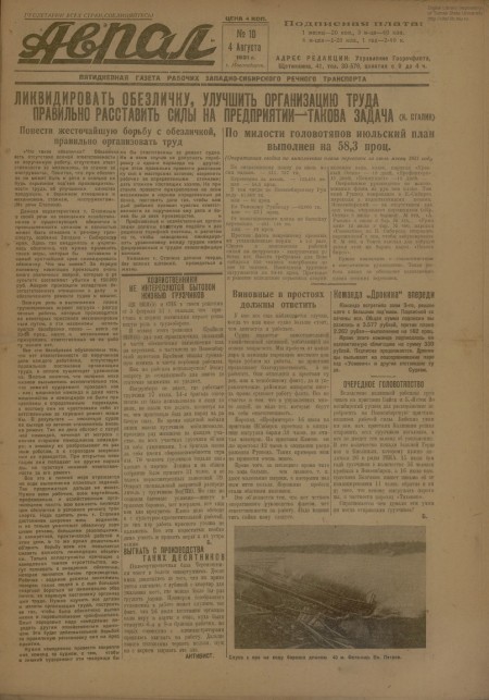 Аврал : орган партруководства речфлота Новосибирского и Томского райкомводов. - 1931. - № 10 (4 августа)