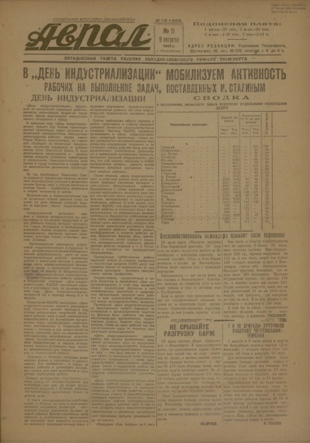 Аврал : орган партруководства речфлота Новосибирского и Томского райкомводов. - 1931. - № 11 (9 августа)