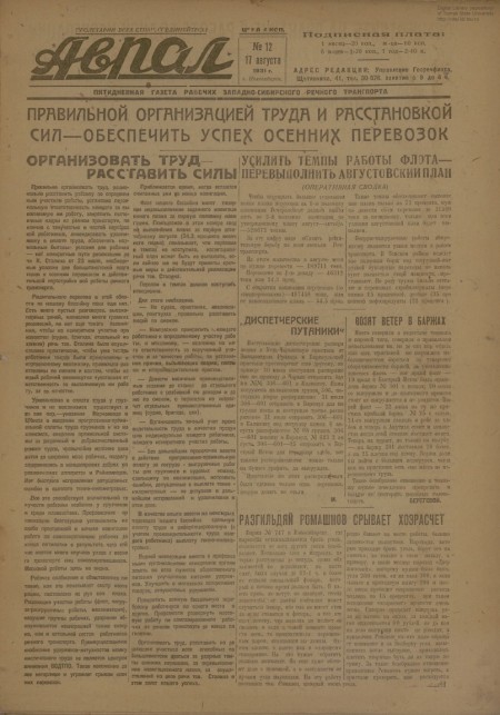 Аврал : орган партруководства речфлота Новосибирского и Томского райкомводов. - 1931. - № 12 (17 августа)