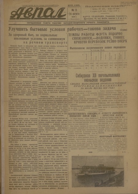 Аврал : орган партруководства речфлота Новосибирского и Томского райкомводов. - 1931. - № 13 (24 августа)