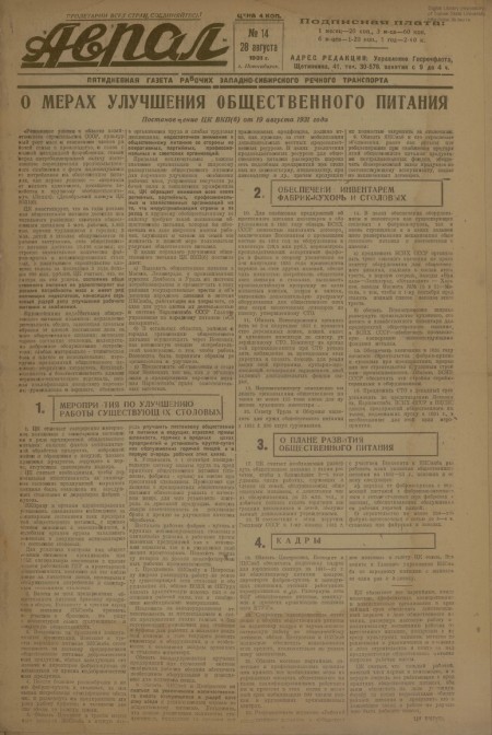 Аврал : орган партруководства речфлота Новосибирского и Томского райкомводов. - 1931. - № 14 (28 августа)