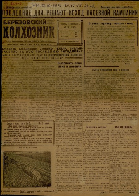 Березовский колхозник : орган Березовского райкома ВКП(б) и райисполкома. - 1931. - № 31 (11 июня)