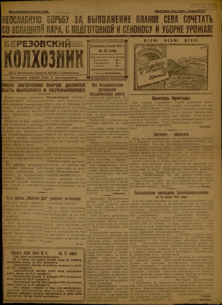Березовский колхозник : орган Березовского райкома ВКП(б) и райисполкома. - 1931. - № 33 (21 июня)
