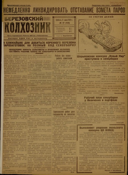 Березовский колхозник : орган Березовского райкома ВКП(б) и райисполкома. - 1931. - № 37 (11 июля)