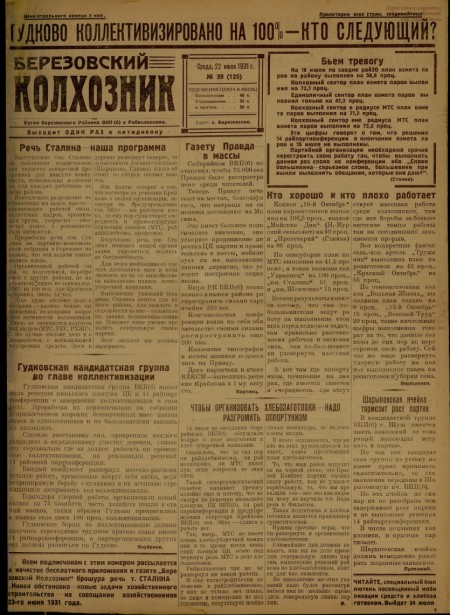Березовский колхозник : орган Березовского райкома ВКП(б) и райисполкома. - 1931. - № 39 (22 июля)
