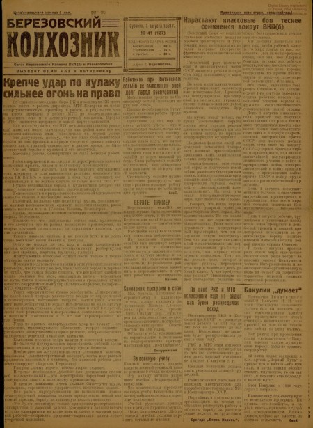 Березовский колхозник : орган Березовского райкома ВКП(б) и райисполкома. - 1931. - № 41 (1 августа)