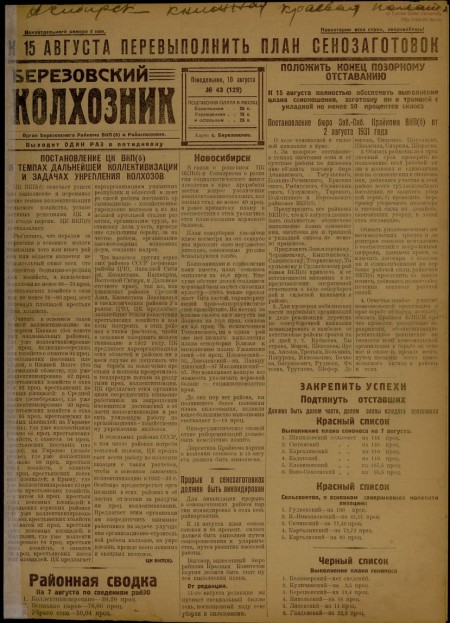 Березовский колхозник : орган Березовского райкома ВКП(б) и райисполкома. - 1931. - № 43 (10 августа)