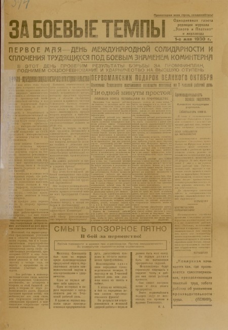За боевые темпы : однодневные газеты редакции журнала " Золото и платина". - 1930. - 1 мая