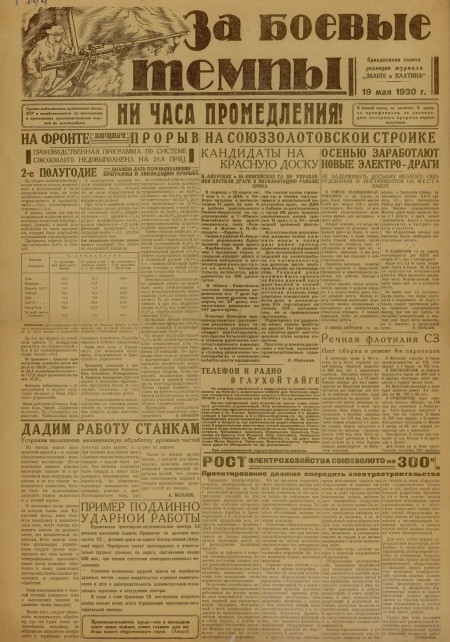 За боевые темпы : однодневные газеты редакции журнала " Золото и платина". - 1930. - 19 мая