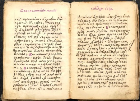Рукопись из фонда библиотеки Новосибирской Православной духовной семинарии, г. Обь.2° (270×178). 399 лл.Фолиация:I л. ф., 1 тит. л., 1, 2, 5 – 136, 146, 138 – 269, 271, 271 – 288, 297, 290 – 400 лл., I л. ф. = II лл. ф. + 399 лл.Записи:На лл. 135-141 запис