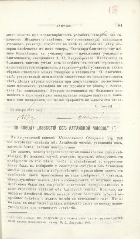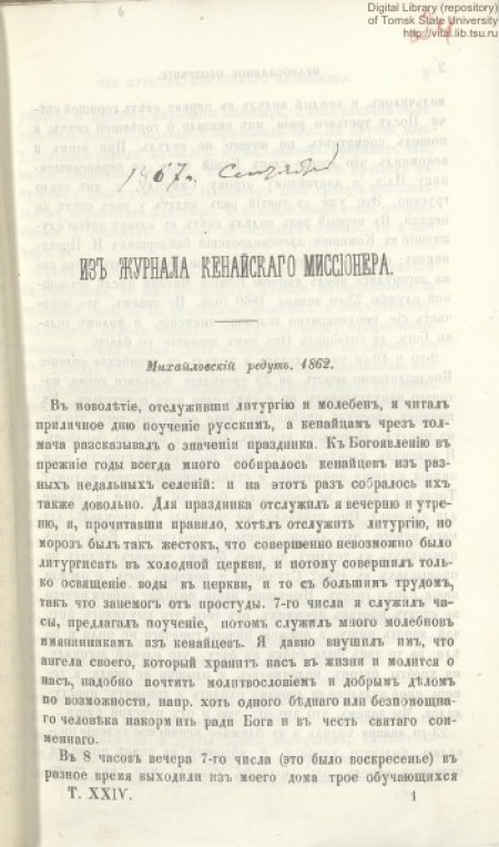 Без тит. л. и обложки. Автор указан в конце текста На С. 1 над текстом владельческая запись чернилами: "1867 г. Сент