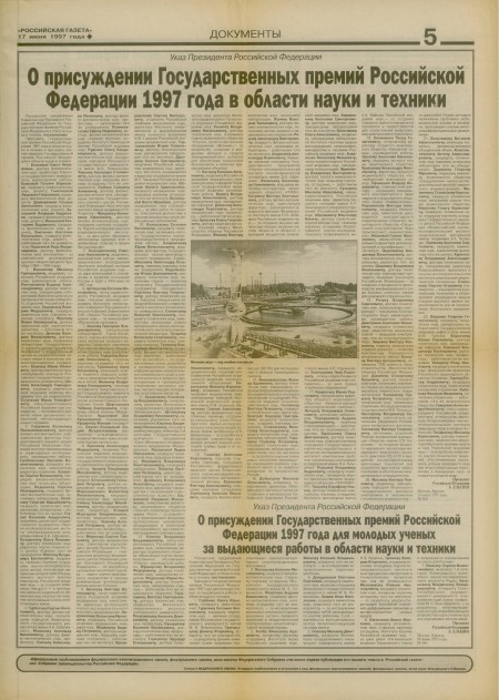 Указ Президента РФ. О присуждении Государственных премий Российской Федерации 1997 года в области науки и техники //"Российская газета". – Томск, 1997. – 17 июня. – С. 5.